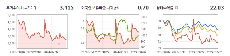 현재 나노엔텍의 주가는 3,415원으로, 전일 대비 3.53원이 하락한 상황입니다. 주주 현황을 살펴보면 에이플러스에셋어드바이저와 그 외 3인이 총 41.12%의 지분을 보유하고 있습니다. 나노엔텍은 의료 장비 및 서비스 분야의 기업으로, 현재 장중 주가는 3,415원입니다. 이 회사의 시가 총액은 1,097억 원이며, 발행된 주식 수는 32,110,082주입니다. 외국인 보유 비중은 0.70%이고, 장중 거래량은 4,474,014주에 달했습니다. 또한, 나노엔텍의 매출액은 66억 원에 이릅니다.