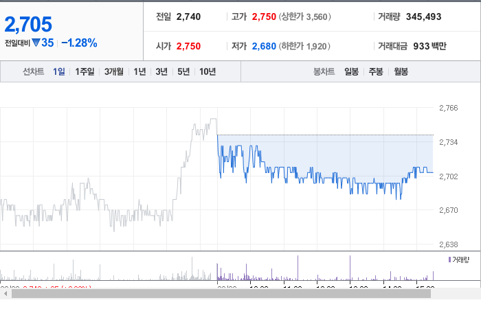 현재 동방의 주가는 2,740원으로, 전일 대비 17.47원이 하락한 상태입니다. 주주 현황을 살펴보면 김형곤과 그 외 4인이 22.85%의 지분을 보유하고 있습니다. 동방은 운송 인프라 기업으로, 현재 장중 기준으로 주가는 2,740원입니다. 동방의 시가 총액은 1,298억 원이며, 발행된 주식 수는 47,971,766주입니다. 외국인의 보유 비율은 2.68%이고, 장중 거래량은 507,743주에 달했습니다. 동방의 매출액은 4,307억 원을 기록했습니다.