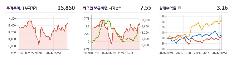 오리온홀딩스의 현재 주가는 15,850원으로, 전일과 동일한 수준을 유지하고 있습니다. 주주 현황을 살펴보면 이화경 외 5인이 총 63.84%의 지분을 보유하고 있습니다. 오리온홀딩스는 식품 산업에 속하는 기업으로, 장중 주가는 15,850원입니다. 이 회사의 시가총액은 9,723억 원이며, 총 발행 주식 수는 62,645,422주입니다. 외국인 투자자의 보유 비율은 7.55%이며, 장중 거래량은 75,169주에 달했습니다. 오리온홀딩스의 매출액은 15,469억 원에 이릅니다.