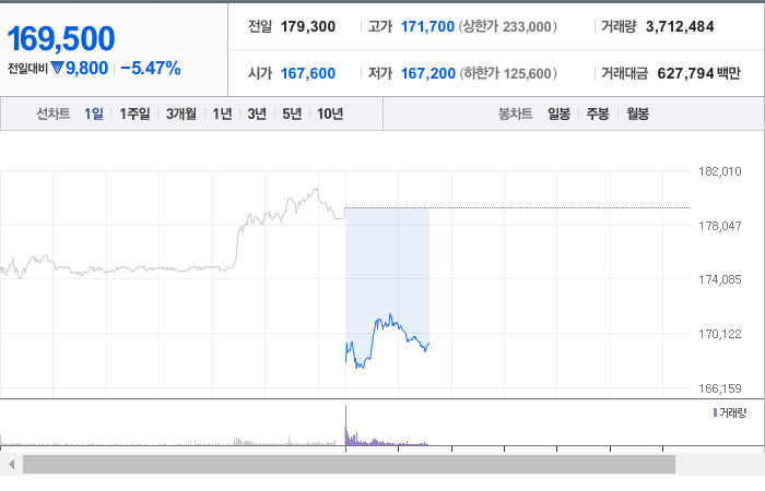 현재 SK하이닉스의 주가는 179,300원으로, 전일 대비 6.52원의 하락세를 보이고 있습니다. SK하이닉스의 주주 현황을 살펴보면, 에스케이스퀘어 및 기타 8명의 주주가 총 20.07%의 지분을 보유하고 있습니다. 이 회사는 반도체 및 관련 장비를 제조하는 기업으로, 장중 주가는 179,300원입니다. SK하이닉스의 시가총액은 123조 2,508억 원이며, 발행된 주식 수는 728,002,365주입니다. 외국인 보유 비율은 54.32%에 달하며, 장중 거래량은 5,590,086주로 기록되었습니다. 또한, SK하이닉스의 매출액은 288,529억 원에 이릅니다.